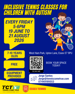 Inclusive Tennis Classes for Children 7-10 years old with Autism. Every Friday 5-6 pm 19 – 21 August. West Ham Park. Read more and see flyer for details.